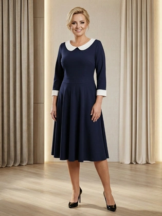 Granatowa sukienka damska midi z kołnierzykiem – elegancka, rozkloszowana kreacja wyszczuplająca 14731