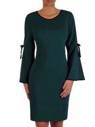 Sukienka z szerokimi rękawami 18589, zielona kreacja z kontrastowymi lamówkami.