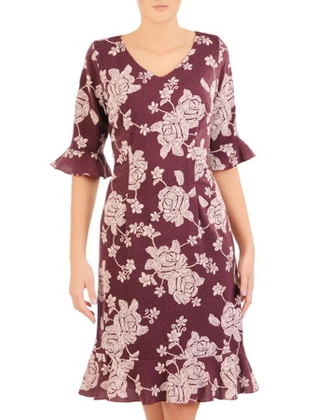 Sukienka w kwiaty, kreacja z ozdobnymi falbanami 31003