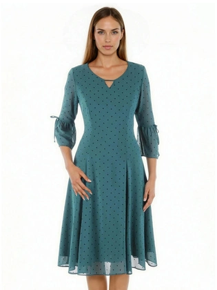 Elegancka, zielona sukienka z ozdobnie wyciętymi rękawami 34430