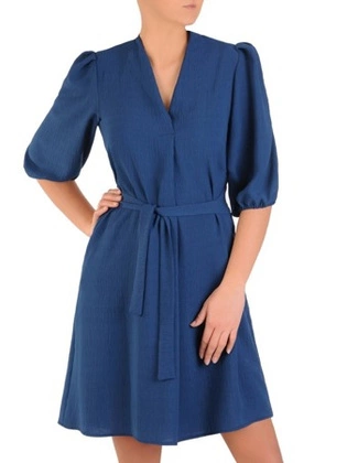 Rozkloszowana sukienka z paskiem, kreacja z gumkami na rękawach 28257