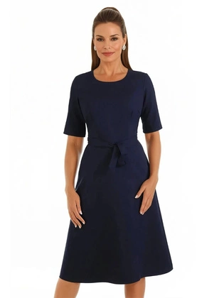 Sukienka w rozkloszowanym fasonie, granatowa kreacja z paskiem 19726
