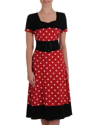 Efektowna sukienka w groszki Wiesława, kreacja w klasycznych kolorach.