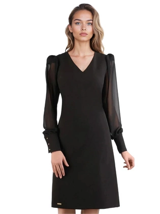 Czarna sukienka z tkaniny, kreacja z bufiastymi rękawami 24245