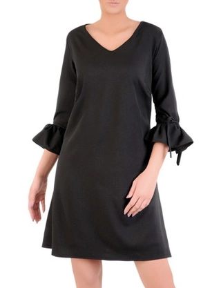 Czarna sukienka z marszczonymi mankietami 18657, elegancka kreacja wizytowa.