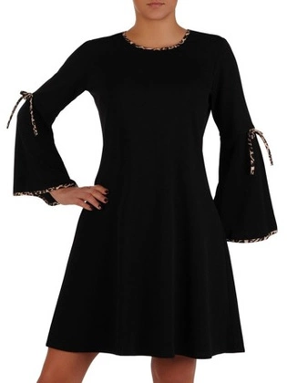 Czarna sukienka z wzorzystymi lamówkami 18584, kreacja w rozkloszowanym fasonie.