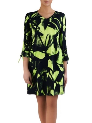 Sukienka z modnie związanymi rękawami 14736, trapezowa kreacja na wiosnę.