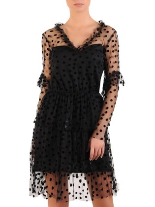 Tiulowa sukienka w groszki, kreacja w rozkloszowanym fasonie 23541