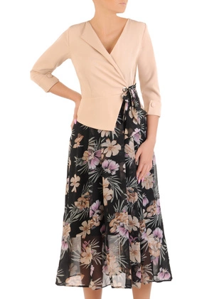 Wiosenna sukienka z kwiatowym topem 15361, kreacja w fasonie maskującym brzuch.