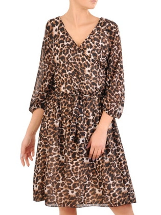 Sukienka na wesele, rozkloszowana sukienka midi z bufiastymi rękawami w zwierzęcy wzór 38493