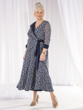 Sukienka wizytowa w groszki, wyszczuplająca kreacja z kopertowym dekoltem 38216