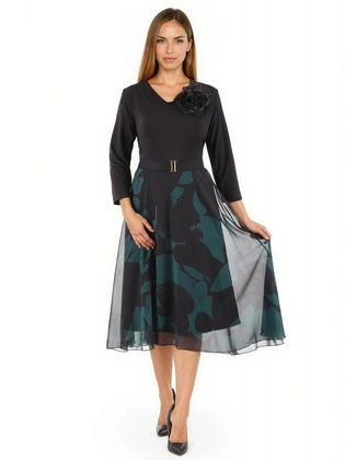 Sukienka damska z wzorzystą spódnicą, kreacja o długości midi 35512