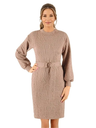 Sukienka dzianinowa, beżowa sukienka wyszczuplająca z dzianiny z paskiem 38955