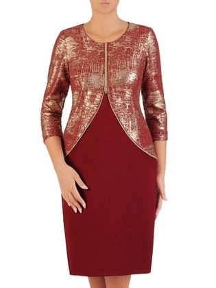 Elegancka sukienka z koronkowym bolerkiem 19365, bordowa kreacja na wesele.