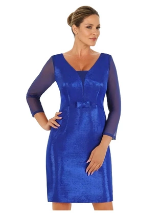 Chabrowa sukienka z koronkowymi rękawami, elegancka kreacja wyszczuplająca 19614