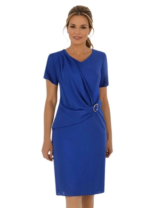 Sukienka damska Szarlin II, chabrowa kreacja w fasonie maskującym brzuch.