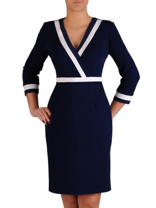 Kopertowa sukienka z kontrastowymi lamówkami 18586, granatowa kreacja z dzianiny.
