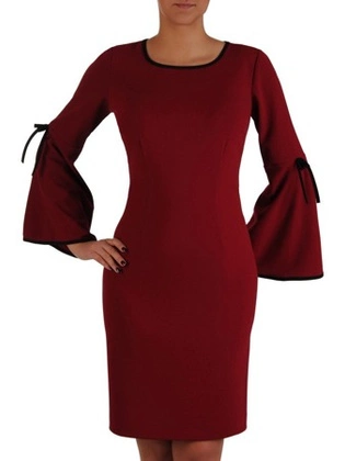 Sukienka z szerokimi rękawami 18588, bordowa kreacja z kontrastowymi lamówkami.