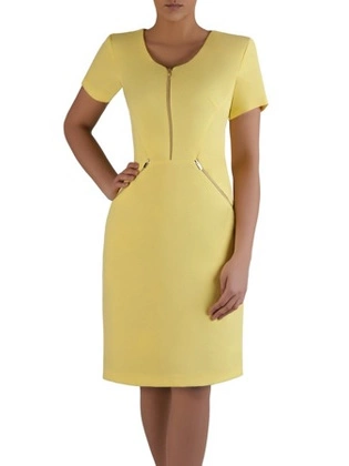 Sukienka z ozdobnymi zamkami Emilia V, piękna kreacja w kolorze żółtym.