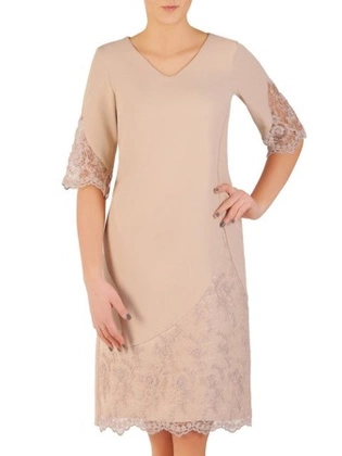 Elegancka beżowa sukienka, kreacja ze wstawkami z koronki 28749
