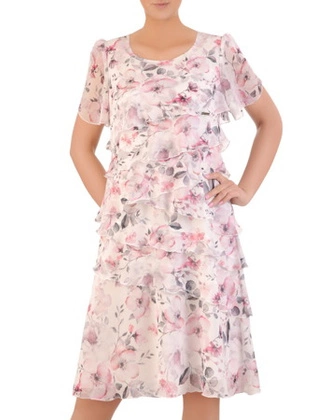 Zwiewna sukienka z falbankami 16736, szyfonowa kreacja w kwiaty.