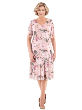 Szyfonowa sukienka w kwiaty, kreacja z ozdobnymi rękawami 25352