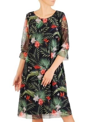 Trapezowa sukienka z tkaniny, zwiewna kreacja w roślinny deseń 33148