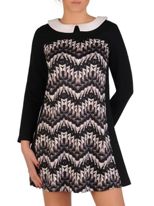 Trapezowa sukienka z szerokim kołnierzem, lekka kreacja z wzorzystego szyfonu 24661
