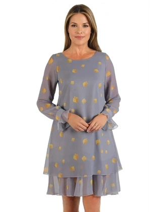 Trapezowa sukienka z szyfonu, kreacja z falbanami na rękawach 27594