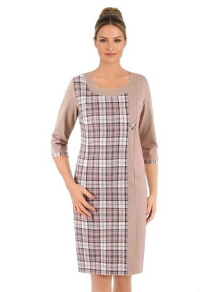Beżowa sukienka dzianinowa z kontrastowymi wstawkami przy dekolcie 38651