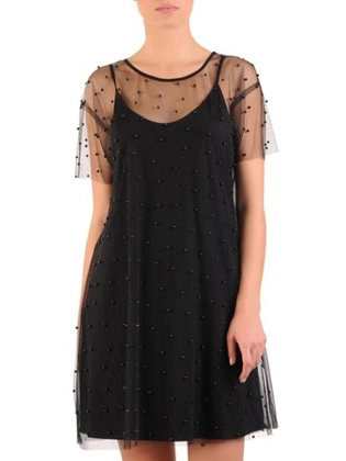 Tiulowa sukienka ozdobiona koralikami, mała czarna w nowoczesnym fasonie 23538