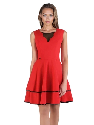 Rozkloszowana sukienka na wesele Karmenita IV, czerwona kreacja z oryginalnym dekoltem.
