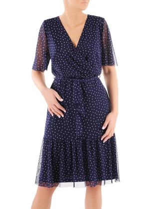 Sukienka z paskiem, rozkloszowana kreacja w groszki 20383.