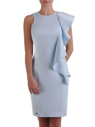 Błękitna sukienka z dekoracyjną falbaną 16724, nowoczesna kreacja wizytowa