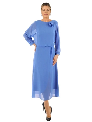 Elegancka, chabrowa sukienka z ozdobnie wyciętymi rękawami 34947