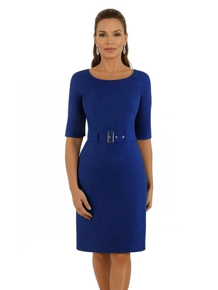 Sukienka damska Akira I, chabrowa kreacja z paskiem podkreślającym talię.