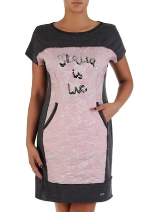 Popielata sukienka z ozdobnymi aplikacjami z koronki 28305