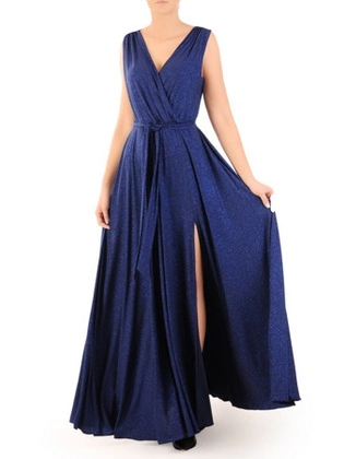 Wieczorowa, kopertowa suknia maxi z połyskującego materiału 30835