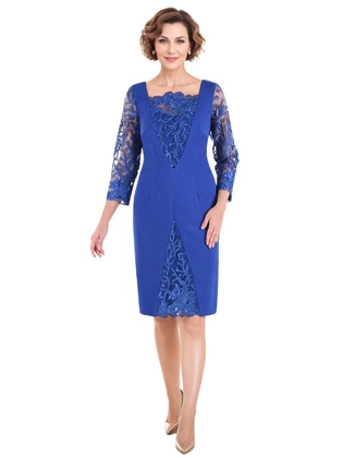 Chabrowa sukienka z koronkowymi rękawami, elegancka kreacja wyszczuplająca 19614