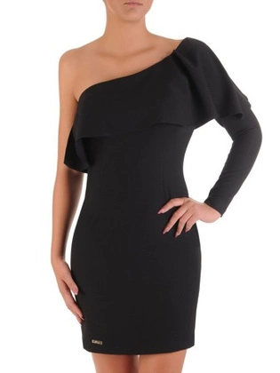 Asymetryczna sukienka z falbaną 17497, czarna kreacja wieczorowa