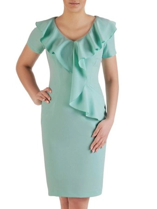 Miętowa sukienka z falbaną na dekolcie, prosta kreacja z tkaniny 20010.