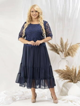 Luźna sukienka z szyfonu, granatowa kreacja z koronkowym topem 30212
