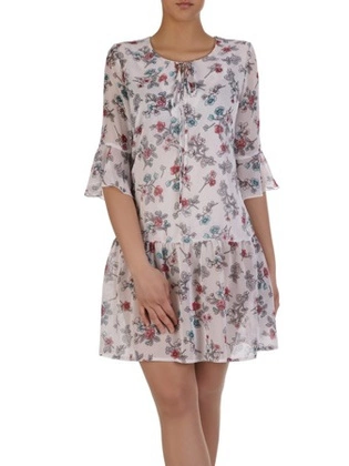 Krótka sukienka z falbanami 17805, zwiewna kreacja w modnym fasonie.