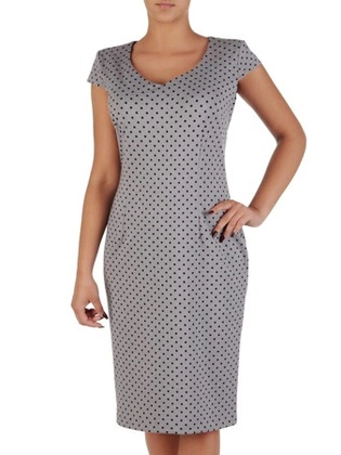 Prosta sukienka w groszki, kreacja z modną wstawką na dekolcie 31469