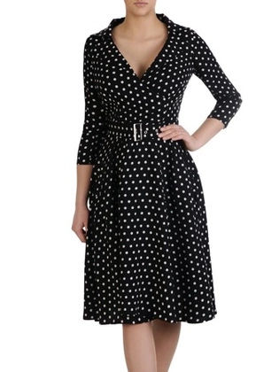 Kopertowa sukienka w groszki 16792, kreacja z modnym żabotem.