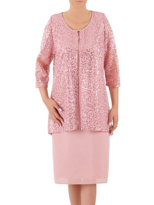 Kostium damski, pudrowa sukienka z koronkowym, połyskującym żakietem 36442
