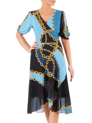 Kopertowa sukienka z szyfonu, rozkloszowana kreacja z paskiem 36510