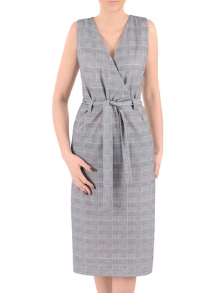 Modna sukienka w kratkę 16615, kreacja z ozdobnym dekoltem.