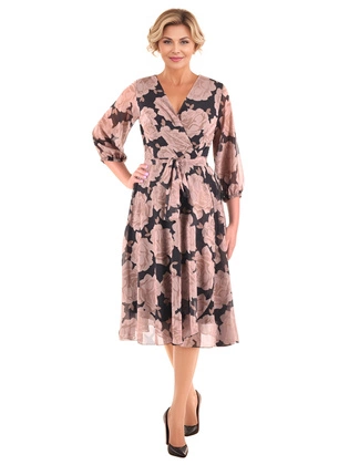 Beżowa sukienka midi kopertowa w kwiaty – elegancka szyfonowa sukienka na wesele 40245