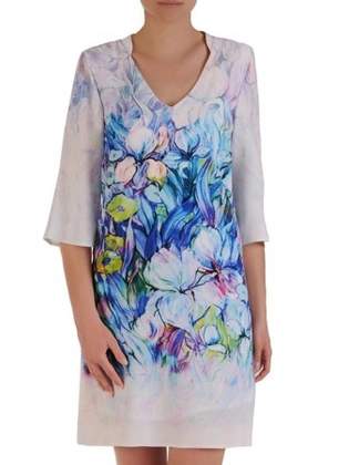 Geometryczna sukienka z kwiatowym nadrukiem 14896, prosta kreacja na wiosnę.